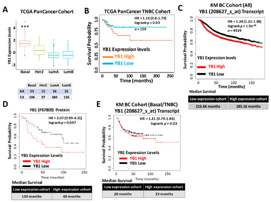 (A) Quantification of Yb1 mRNA expression levels based on log2 RSEM values batch normalized from Illumina HiSeq RNASeq data by breast cancer subtype in the breast cancer BRCA patient data from TCGA PanCancer Atlas. Expression levels of YB1 are significantly higher (*** p < 0.0001, Wilcoxon) in the basal (TNBC) subtype when compared to other BC subtypes. (B) Survival analysis based on YB1 expression levels (median values) in the basal subtype of the TCGA BRCA PanCancer Atlas cohort. YB1 activation in TNBCs is associated with poorer overall survival (p = 0.049). (C) KM plot correlating survival of 4929 BC patients with YB1 mRNA expression levels. High YB1 expression levels correlate with poor survival probability in BC patients (p < 1.9 × 10−8). (D) KM plot correlating the survival of BC patients with YB1 protein expression levels. High YB1 expression levels correlate with poor survival probability in BC patients (p = 0.047). (E) KM plot correlating the survival of TNBC patients with YB1 mRNA expression levels. High YB1 expression levels correlate with poor survival probability in TNBC patients (p = 0.03).