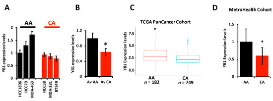 (A) YB1 mRNA transcript quantification in AA and CA TNBC cell lines was determined by qt-RT-PCR and data was plotted as the fold change in HCC1806. (B) Average YB1 mRNA transcripts in AA and CA TNBC cell lines was plotted as the fold change in AA cell lines. YB1 transcript expression levels are significantly higher (* p < 0.001, Student ’t test) in AA TNBC cell lines when compared to their CA counterparts. (C) Comparison of YB1 expression levels, levels based on log2 RSEM values batch normalized from Illumina HiSeq RNASeq data, between AA and CA BC patients from the TCGA BRCA PanCancer Atlas cohort. YB1 expression levels are significantly higher (* p < 0.01, Wilcoxon) in AA when compared to CA BC tumors. (D) Comparison of YB1 expression levels between CA and AA TNBC from the MetroHealth TNBC cohort, as determined by qt-RT-PCR. Data was plotted as the fold change to AA tumors. YB1 expression levels are significantly higher (* p < 0.01, Student ’t test) in AA when compared to CA BC tumors.