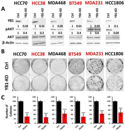 The AKT pathway is widely documented to be affected by the loss of YB1 expression [60], which we confirmed in our YB1-KO cells where phosphorylation levels of AKT were decreased in all six cell lines as a result of the loss of expression of YB1 (Figure 3A). Next, we used the colony formation assay as an in vitro indicator assay for the oncogenicity of cancer cells, and found the loss of YB1 expression to significantly inhibit the colony formation potential of all six cell lines (Figure 3B,C). While colony formation was reduced in all six TNBC cell lines, the fold reduction in the AA cell lines ranged from 1.8 to 3 and averaged a 2.4-fold inhibition when compared to the CA cell lines, where the fold reduction ranged from 2.5 to 3.25 with and an average of 2.95-fold inhibition (Figure 3C). These data indicate that the CA TNBC cells are more sensitive to the loss of YB1 activity when compared to their AA counterparts, which show more addiction to YB1.