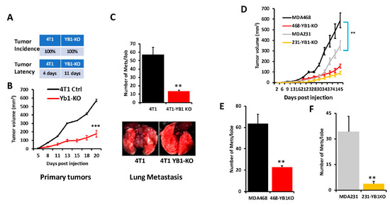 (A) Incidence (top) and latency (bottom) of tumor growth of prenatal 4T1 or its YB1-KO derivative cells that were inoculated in the mammary fat pads of female Balb/C mice (n = 5 mice per group). (B) Quantification of tumor volume of tumors generated from the inoculation of control 4T1 cells or their YB1-KO derivatives into the mammary fat pads of female Balb/C mice. (C, top panel) Quantification of lung metastasis nodules from the animal experiment described in (B). The bottom panel shows representative lungs from each mouse group. (D) Quantification of the tumor volume of tumors generated from the inoculation of control MDA-MB-231 (grey graph), MDA-MB-468 (black graph) cells or their respective YB1-KO derivatives (yellow and red graphs, respectively) into the mammary fat pads of female NSG mice (n = 5 mice per group). (E,F) Quantification of lung metastasis nodules from the MDA-MB-468 (E) and the MDA-MB-231 animal experiment described in (D) (**, p < 0.001, Student ’t-test).