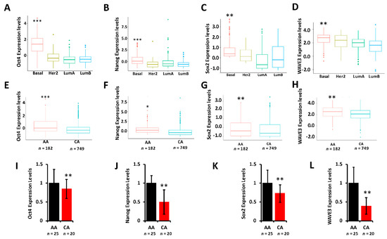 (A–D) Comparison of the expression levels of Oct4 (A), Nanog (B), Sox2 (C), and WAVE3 (D) between the BC subtypes in the TCGA BRCA PanCancer Atlas cohort. (**, p < 0.001; ***, p < 0.0001, Wilcoxon). (E–F) Comparison of the expression levels of Oct4 (E), Nanog (F), Sox2 (G), and WAVE3 (H) between AA and CA BC patients in the TCGA BRCA PanCancer Atlas cohort. (*, p < 0.01; **, p < 0.001; ***, p < 0.0001, Wilcoxon). In all cases, mRNA expression levels were based on log2 RSEM values batch normalized from Illumina HiSeq RNASeq data. (I–L) Comparison of the expression levels of Oct4 (I), Nanog (J), Sox2 (K), and WAVE3 (L) between AA and CA BC patients in the MetroHealth cohort, as determined by qt-RT-PCR. Data were plotted as fold change to AA tumors. (* p < 0.01, **, p < 0.001; ***, p < 0.0001, Wilcoxon).