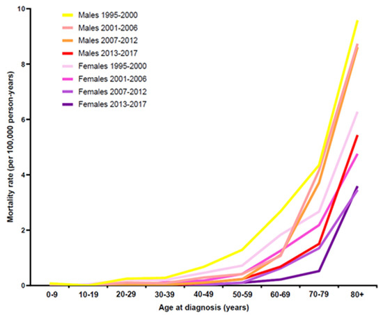 In males, a clear decrease of age-specific mortality rates was observed above the age of 40 yrs for the later three time periods in comparison to the first time period. The age-specific male mortality rate of the second (2001–2006) and third (2007–2012) time periods approximated above the age of 70 yrs with the male patient curve of the first time period. For the females, the age-specific mortality rate curves decreased with each time period, except for the age group of 80+ yrs.