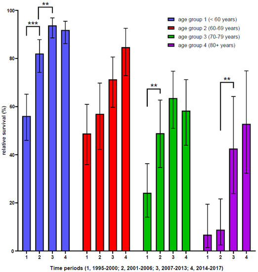 Relative five-year survival of CML patients in Swiss CCRs grouped by age and time periods. Significance of five-year relative survival of CML patients is shown as follows: **, <0.01; ***, <0.001; (see also Tables S3 and S4).