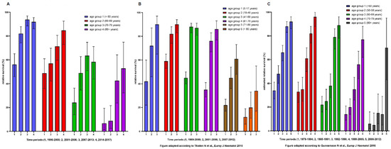 A significant improvement in five-year OS and RS over the complete observed time period was found for all patients and all age groups. Taking all age groups together, we found that the RS of CML patients significantly increased at 5 yrs from 35.7% for 1995 to 2000, to 53.2% for 2001 to 2006, to 70.7% for 2007 to 2012, and up to 74.4% for 2013 to 2017 (see Table S3). Detailed age-related RS curves over 5 yrs after diagnosis are depicted in Figure S1A–D.