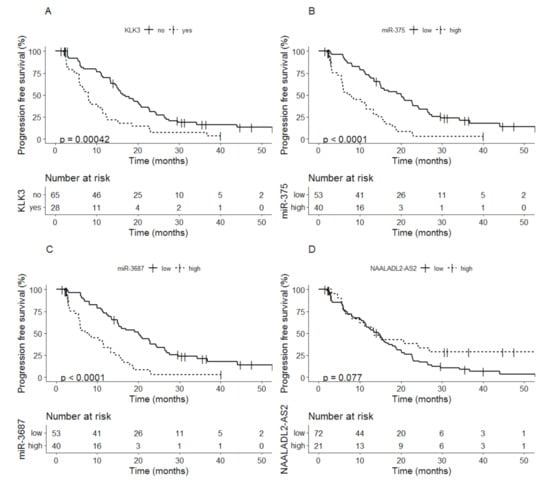 Kaplan-Meier analysis of progression-free survival based on baseline values of (A) KLK3, (B) miR-375, (C) miR-3687 and (D) NAALADL2-AS2.