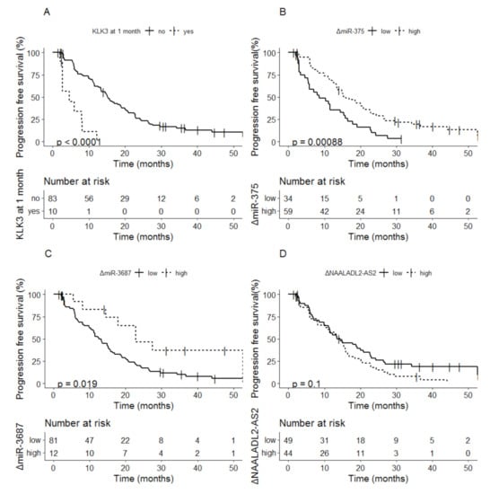 For KLK3, 17 patients with detectable levels of KLK3 at baseline had undetectable levels at 1 month, only 1 patient had undetectable levels at baseline and detectable levels at 1 month. Detectable vs. undetectable levels of KLK3 after 1 month of therapy was related to a median PFS of 4.6 months (95% CI; 2.72–NA) vs. 15.2 months (95% CI; 13.3–20.0) (p < 0.0001) (Figure 2A). For miR-375, delta values below the cutoff at 1 month were related to shorter PFS compared to delta values above the cut-off: 8.5 months (95% CI; 5.8–15.7) vs. 15.9 months (95% CI; 13.3–22.6) (p = 0.00088) (Figure 2B). For miR-3687, delta values below the cutoff were related to shorter PFS compared to delta values above the cutoff after 1 month of therapy: 13.3 months (95% CI; 11.0–15.7) vs. 22.9 months (95% CI; 17.9–NA) (p = 0.019) (Figure 2C). For NAALADL2-AS2 no effect of 1 month dynamics in biomarkers (increase or decrease) was observed (p = 0.1) (Figure 2D).