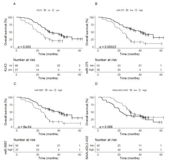 Kaplan-Meier analysis of overall survival based on baseline values of (A) KLK3, (B) miR-375, (C) miR-3687 and (D) NAALADL2-AS2.