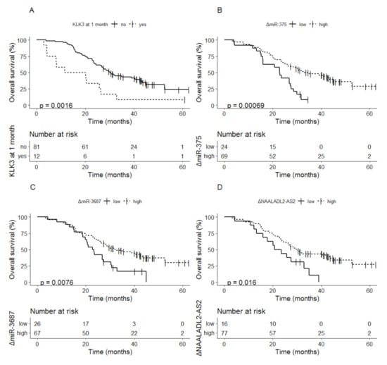 Kaplan-Meier analysis of overall survival based on delta values at 1 month for (A) KLK3, (B) miR-375, (C) miR-3687, and (D) NAALADL2-AS2.