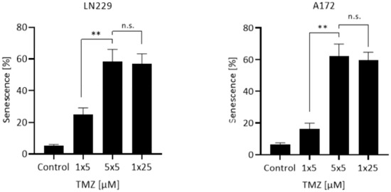 CSEN induced in LN229 and A172 cells following treatment with a single dose of 5 µM, repeated doses of 5 µM, and a single dose of 25 µM. Data are presented as mean of three independent experiments with triplets measured ±SEM and compared by unpaired t-test with Welch’s correction. n.s. = not significant; ** p < 0.01.