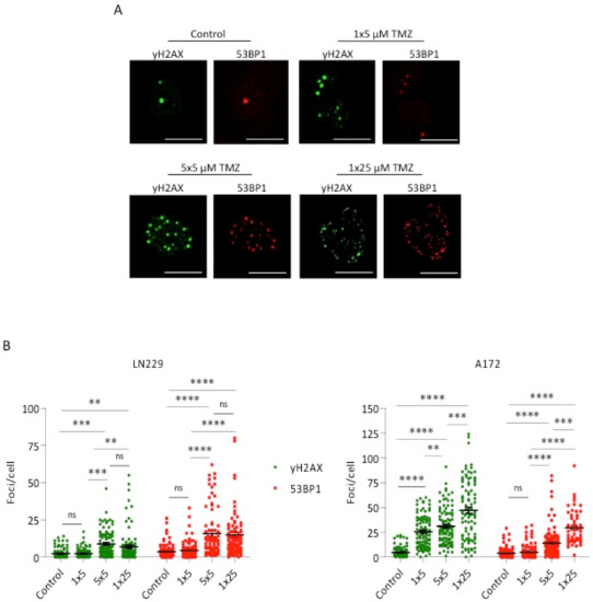 Induction of DSBs, measured by γH2AX and 53BP1 staining and foci quantification through LSM, in LN229 and A172 following a single dose of 5 or 25 µM or 5 repeated doses, each of 5 µM TMZ. (A) Representative images for γH2AX and 53BP1 foci staining in LN229 cells for the indicated treatments. Scale bars indicate 30 µm. (B) Foci number per cell in the controls and upon treatment. Data of a representative experiment are shown, with 100 cells counted for each treatment. Bars indicate the mean. n.s. = not significant; ** p < 0.01; *** p < 0.001; **** p < 0.0001.