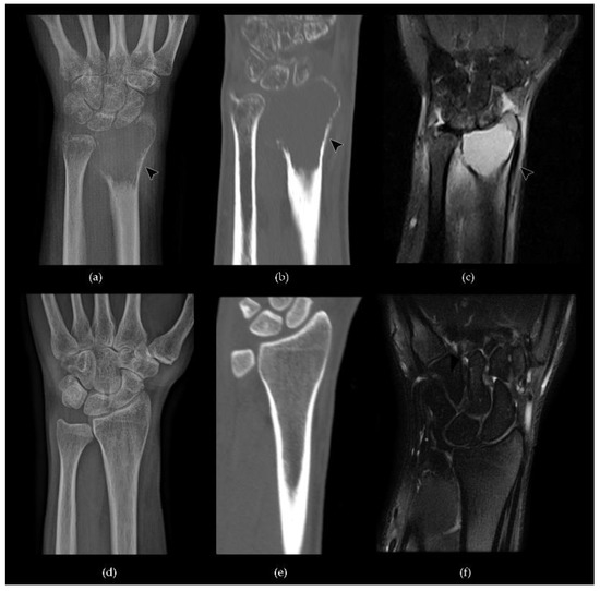 A case of GCTB of the distal metaepiphysis of the right radius with the involvement of the radiocarpal joint (a–c, arrowhead) compared to normal bone (d–f): (a) conventional radiography shows an osteolytic lesion with cortical thinning and endosteal scalloping with no periosteal reaction; (b) a coronal computed tomography (CT) scan highlights multiple cortical interruptions; (c) a coronal STIR magnetic resonance imaging (MRI) sequence shows a lesion with homogeneous signal hyperintensity; (d–f) conventional radiography, CT and STIR MR imaging of normal bone findings.