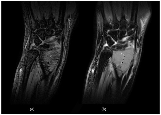 MRI appearance of hemosiderin deposits (arrows) in a case of GCTB of the left radial metaepiphysis (a). T2*-W GRE sequence demonstrates a markedly and distinctly hypointense area that appears more tenuously hypointense in a T2-W Fast Spin Echo (FSE) sequence (b).