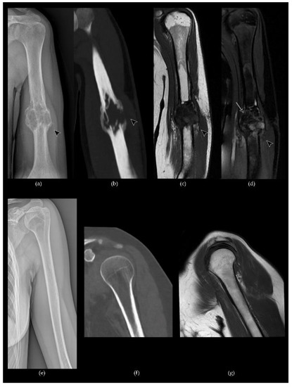 A case of GCTB of the left humerus diaphysis (a–d, arrowhead) compared to normal bone (e–g): (a) conventional radiography shows an osteolytic alteration of the bone with a pluri-chambered appearance in relation to the cystic components; (b) a coronal CT Maximum Intensity Projection (MIP) shows the erosion of the cortical bone with loss of the classic trabeculation and pathological fracture associated; (c) on a coronal T1-W FSE MR image, the lesion demonstrates inhomogeneous low signal intensity with a pathological involvement of the adjacent soft tissues; (d) a coronal fat-suppressed T2-W FSE MR image shows heterogenous signal intensity, with cystic components characterized by focal hyperintensity and hemosiderin deposits (arrow); (e–g) conventional radiography, CT and T1-W FSE MR images of normal bone findings.