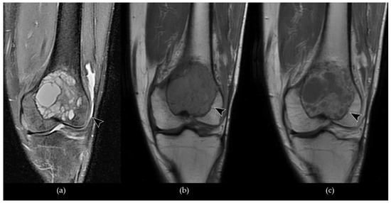 Coronal MRI of a GCTB of the distal metaepiphysis of the left femur (arrowhead) with associated joint effusion: (a) a fat-suppressed T2-W FSE scan shows a lesion with inhomogeneous signal hyperintensity in relation to the presence of multiple cystic components; (b) a T1-W FSE image shows non-uniform signal hypointensity; (c) a post-contrast T1-W FSE image demonstrates heterogeneous enhancement of the lesion, predominantly peripheral, and well discriminates the cystic and solid components.