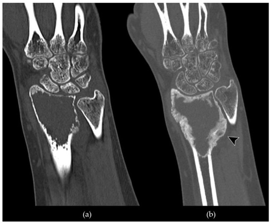 Coronal CT scan of a giant cell tumor of bone of the distal metaepiphysis of the radius treated with denosumab: (a) a pre-treatment image shows an osteolytic lesion with noticeable cortical thinning and endosteal scalloping; (b) a post-treatment image demonstrates peripherical osteosclerosis around the lesion with neocortex formation (arrowhead).
