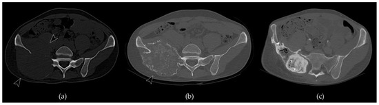 Axial CT scan of a case of GCTB of the sacrum and right iliac wing treated with denosumab and then subjected to surgical osteotomy: (a) a pre-treatment image shows an extensive osteolytic lesion, which extends to the adjacent soft tissues, involving the gluteal area and the pelvis (arrowheads); (b) a post-denosumab image demonstrates peripherical deposition of bone matrix with neocortex formation and intralesional osteosclerosis (arrowhead). A modest size reduction of the lesion can also be noted in relation to the shrinkage effect; (c) post-surgical evaluation highlights the outcomes of osteotomy in the right iliac wing filled with cement and two K-wires.