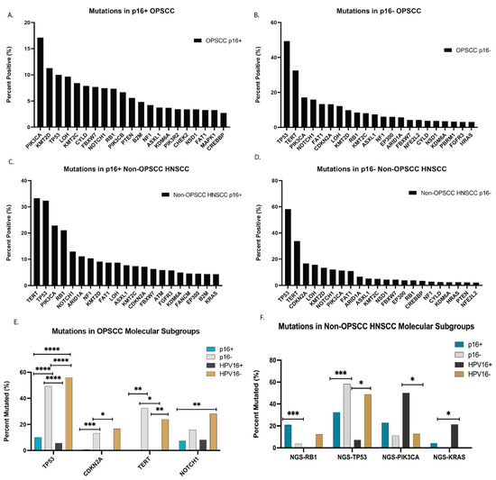 Genetic landscape of p16+ and p16− OPSCC. (A–D) Whole-exome sequencing (WES), targeted Next-Generation Sequencing (NGS), and whole-transcriptome sequencing (WTS) were performed to identify the most common mutations and are graphically represented by labeled subgroups. (E,F) OPSCC and HNSCC groups were analyzed to detect the most prevalent mutations in p16 and HPV positive and negative groups. Statistical significance was determined using the chi-squared test and Benjamini–Hochberg correction. **** denotes p < 0.00005, *** denotes p < 0.0005, ** denotes p < 0.005, * denotes p < 0.05.