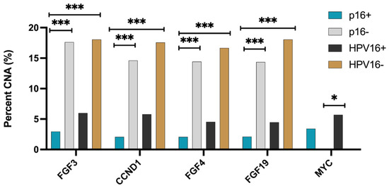 Copy Number Alterations (CNA) in p16+/− and HPV16 +/− OPSCC. Copy number amplifications were detected by WES in p16+, p16−, HPV16+, HPV16− oropharyngeal tumors. Statistical significance was determined using the chi-squared test and Benjamini–Hochberg correction. *** denotes p < 0.0005 * denotes p < 0.05.