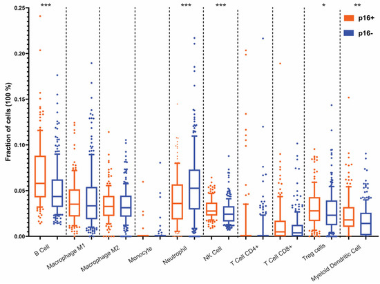 Immune cell infiltration in p16+ vs. p16− OPSCC. Immune cell fractions were calculated using QuanTIseq computational pipeline and RNA-seq data. The following immune cells were assessed: B cells, M1 and M2 macrophages, Monocytes, Neutrophils, NK cells, CD4+ and CD8+ T cells, Treg cells, and Myeloid dendritic cells in p16+ and p16−oropharengeal tumors. Statistical significance was determined using the chi-squared test and Benjamini–Hochberg correction. *** denotes p < 0.0005, ** denotes p < 0.005, * denotes p < 0.05.