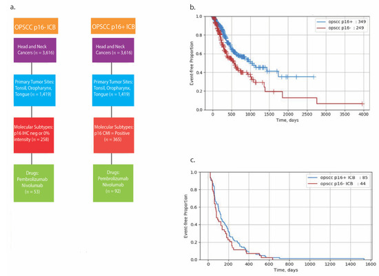 Real-World Overall Survival (rwOS) in OPSCC patients. Consort diagram detailing real-world data cohorts (a) Kaplan–Meier curves representing (b) rwOS in p16+ vs. p16− OPSCC and (c) TOT in p16+ vs. p16− OPSCC treated with ICB.