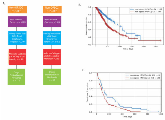 Real-World Overall Survival in non-OP HNSCC patients. Consort diagram detailing real-world data cohorts (A). rwOS in non-OP HNSCC. Kaplan–Meier curves representing (B) rwOS in p16+ vs. p16− non-OP HNSCC and (C) TOT in p16+ vs. p16− non-OP HNSCC treated with ICB.