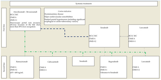 However, TKIs (lenvatinib and sorafenib) remain an alternative in first-line standard of care in international guidelines (the European Association for the Study of the Liver, American Association for the Study of Liver Diseases, Asian Pacific Association for the Study of the Liver, European Society for Medical Oncology, and National Comprehensive Cancer Network [6,10,11,12,13]). However, TKIs are now currently indicated in patients with advanced or unresectable HCC not eligible for atezolizumab plus bevacizumab, with well-preserved liver function (Child-Pugh (CP) class A) and an Eastern Cooperative Oncology Group (ECOG) Performance Status (PS) of 0–2, [14,15]. The place of TKIs in second line after atezolizumab and bevacizumab is not consensually defined due to a lack of data from clinical trials.