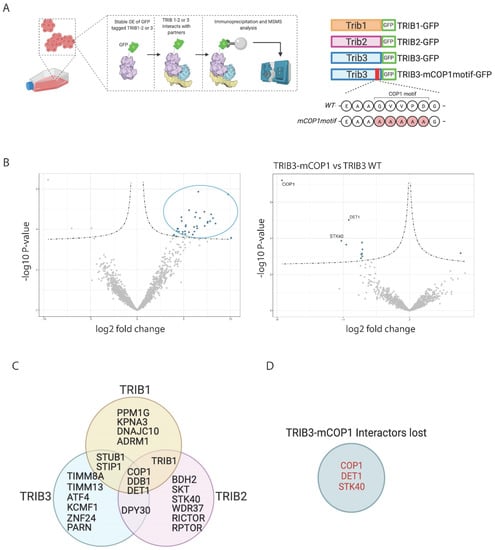 TRIB1, -2 and -3 interactomes in HEK293T cells. (A) Schematic representation of workflow followed for AP-MS experiments. Figure was created with BioRender.com. (B) Volcano plots showing TRIB3 interactors compare to GFP control and TRIB3-mCOP1 interactors compared to WT TRIB3 in HEK293T cells. (C) Venn diagram of common and unique interactors between Tribbles family members. (D) TRIB3 interactors lost when comparing TRIB3 vs TRIB3-mCOP1 interactomes.