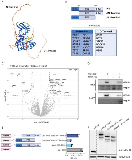 The N- and C-terminal domains of TRIB3 are unstructured domains for which a 3D conformation cannot be predicted based on the amino acid sequence, as shown in Figure 2A [7]. In order to understand the contribution of the different domains of TRIB3 (N- and C-terminus and pseudokinase domain) to its interactome and to gain an insight into how these interactions take place, we generated TRIB3 mutants lacking the N-terminal domain (amino acids 1–69, TRIB3-ΔN-terminal) and the C-terminal domain (amino acids 316–358, TRIB3-C-terminal) and performed an AP–MS experiment, as described above (Figure 2B). A summary of the top 25 interactions of the C-terminal and N-terminal domains is shown in Table 4. In agreement with previous studies [45], the interaction with COP1 and DET1 requires the presence of the C-terminal domain, as binding is lost with the TRIB3-ΔC mutant (Figure 2C). Moreover, novel proteins related to the ubiquitin degradation system were also found binding to the C-terminal domain of TRIB3, such as UBR2, an E3 ubiquitin-protein ligase that controls cell growth via mTOR signaling [48]. These findings confirm the concept that the C-terminal domain is required for TRIB3 to act as a degradation platform. In addition to the E3 ubiquitin ligases we also identified USP16, a deubiquitinating enzyme that plays an important role in mitosis [49], suggesting a role for TRIB3 in this process as well. In addition, STK40 and DOCK11 were also found to interact through the C-terminal domain of TRIB3. This reinforces the notion that Tribbles proteins and the Tribbles-like protein STK40 can form the homo/hetero dimers mentioned above. DOCK11 is a guanine nucleotide-exchange factor that activates CDC42 and RAC1 [50]; the biological relevance of this interaction remains to be established.