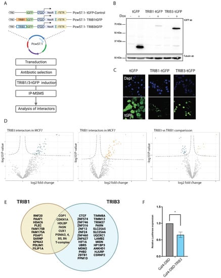 Having developed a robust AP–MS workflow to identify the interaction partners of Tribbles proteins, we wished to address the different roles of TRIB1 and TRIB3 in breast cancer, where high levels of both proteins have been reported to be associated with poor prognosis and lower survival rates [26,61,62]. For this we generated inducible TRIB1-tGFP and TRIB3-tGFP stable cell lines in the breast cancer cell line MCF7, a model for luminal A breast cancer, allowing immediate short-term overexpression of TRIB1 and -3, as well as control over the amount of protein being overexpressed. A summary of the constructs used and the workflow followed to identify interacting proteins is depicted in Figure 3A. Expression of TRIB1-tGFP, TRIB3-tGFP and -tGFP was observed by Western blot after 24 h treatment with doxycycline and no expression was observed in untreated cells (Figure 3B and File S2). TRIB3 was predominantly—but not exclusively—localized in the nucleus as determined by confocal microscopy (Figure 3C). In contrast to the predominant nuclear localization of TRIB1 in HEK293T cells ([18] data not shown) TRIB1 was mainly localized in the cytoplasm in MCF7 cells (Figure 3C), supporting the view that subcellular localization of Tribbles depends on cellular context and conditions [17].