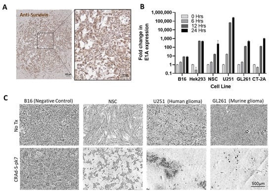 The murine GL261 cell line supports replication of the human adenovirus CRAd-S-pk7. (A) GL261 was engrafted in brain of C57/BL-6 immunocompetant mice. Fourteen days later, harvested brain was cryosectioned. Brightfield image is shown of brain slice stained with Anti-survivin primary, HRP-conjugated secondary, and DAB substrate. (B) Quantitative PCR results showing amplification of CRAd-S-pk7 specific E1A gene expression at select timepoints post-infection in both non permissive (B16); and permissive (HEK293, NSC, U251, GL261, CT-2A) cell lines. (C) Representative phase-contrast images acquired after three days of culture are shown. Cultures contained B16 (negative control), HB1.F3.CD21 (positive control), GL261 (murine glioma), and U251 (human glioma) cells infected with CRAd-S-pk7 at MOI 10 or no virus control. Scale bar = 500 µm and applies to all images in (C).