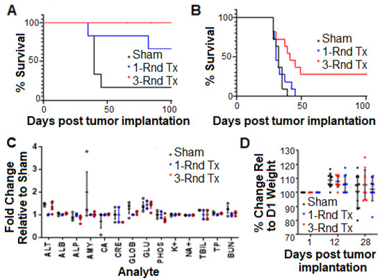 Our immediate translational objective restricted our study to a dose-equivalent to 150 million NSC.CRAd-S-pk7s (1.875 × 1011 Viral Particles). In a study of one vs. six cycles of measles virotherapy for ovarian cancer [42], multiple cycles were only advantageous at lower doses. While our study demonstrates improved treatment efficacy after three treatment cycles, it is possible that, at higher doses, no benefit would be seen. Furthermore, long-term repeat dosing regimens might eventually result in no additional therapeutic benefit. The present study also does not address the optimal frequency for repeated dosing. An interval of 1 week was selected in both preclinical and clinical settings to allow sufficient time for an adaptive immune response to occur in response to each successive treatment. Lastly, these IND-enabling studies assume that the basic features of the immune response to NSC.CRAd-S-pk7 treatments are similar in mice and humans [43]. While this assumption is generally valid for acute viral infections, there are some notable differences, particularly in FoxP3 and CD4 expression levels [44].
