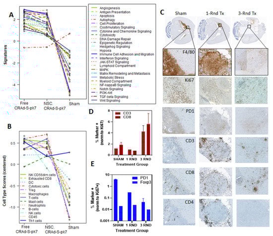 Immunological effects of NSC.CRAd-S-pk7 administration in syngeneic glioma orthograft model. (A,B) Plots depicting mean normalized expression of NanoString analysis pathway signature and cell type differentiation scores obtained using RNA isolated from C57/Bl-6 mice bearing CT-2A glioma seven days after treatment with either sham saline, CRAd-S-pk7, or dose-matched NSC-CRAd-S-pk7 (n = 3 per group). (C,D) Tumors were established using 5.0 × 103 GL261 cells/mouse, then treated using either a Day 7 single dose or three doses of 5.0 × 105 HB1.F3.CD_CRAd-S-pk7 cells on days 7, 14, and 21 (n = 2 per group). Twenty-eight days after the first treatment, brains were cryosectioned and processed using standard immunological techniques. Positive cell quantification was automated using ImagePro segmentation software. Results are expressed normalized with respect to Ki-67 positive cells. (E) Representative brain sections stained with F4/80, then 10× scanned images were tiled to showing the relative sizes of GL261 tumor in mice brains that received either sham, one round of NSC.CRAd-S-pk7, or three rounds of NSC.CRAd-S-pk7. Inset enlarged to aid visualization (10×). Sister brain sections stained with anti-Ki-67, anti-PD1, anti-CD3, anti-CD8, and anti-CD4 are shown.