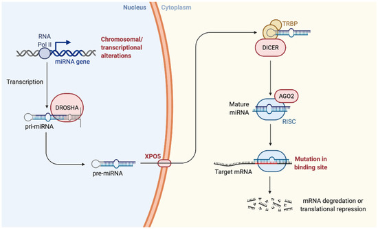 The aberrant expression of miRNA may be due to mutations in its sequence that cause a reduction in the expression of mature miRNA or an altered regulation of the target gene [43]. The activity of these small regulatory elements can also be altered by genomic rearrangements such as deletions or duplications of the genomic region in which the miRNA is located, or translocations that relocate the miRNA under the control of a new promoter.
