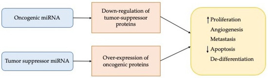 Moreover, the discovery that miRNAs play a vital role in different types of tumour and since they have the advantage of being able to act both as oncogenes and as tumour suppressors they are still considered potential tumour therapeutic targets [48]. Carcinogenesis is favoured by oncogenic miRNAs, which are then over-expressed; on the contrary, the tumour suppressor action is due to a decrease in particular miRNAs (Figure 2). In light of the above, the antagomirs lead to a downregulation of the oncomirs. The concept of “miR replacement therapy” was thus introduced thanks to the observation of the reduction of the pathology following the action of suppressive miRNAs, with the aim of increasing the amount of reduced miRNAs and bringing them to normal values. This approach has great potential to be a more practical strategy than silencing individual genes by siRNAs and represents one of the major commercial areas of interest in today’s biotechnology market.