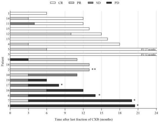 Response and survival. Abbreviations: CR = complete response; PR = partial response; SD = stable disease; PD = progressive disease; CXB = contact X-ray brachytherapy. * Four patients received salvage surgery. ** Deceased.