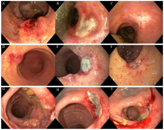 Endoscopic responses following contact X-ray brachytherapy of three patients. (A) Regrowth following chemoradiotherapy (50 Gy/25 fractions) for a cT3N0M0 rectal tumor before contact X-ray brachytherapy; (B) partial response showing a deep ulcer three months following contact X-ray brachytherapy (90 Gy/3 fractions); (C) endoscopic complete response six months following treatment; (D) residual tumor following radiotherapy (25 Gy/5 fractions) for a cT2N1M0 rectal tumor before contact X-ray brachytherapy; (E) partial response showing a deep ulcer three months following contact X-ray brachytherapy (90 Gy/3 fractions); (F) partial response showing a healing ulcer six months following treatment; (G) residual lesion of 4 cm following high-dose-rate brachytherapy for a cT2N0M0 rectal tumor before contact X-ray brachytherapy to achieve symptom control; (H) partial response showing a deep ulcer three months following contact X-ray brachytherapy (60 Gy/2 fractions); (I) sustained partial response showing a deep ulcer six months following treatment.