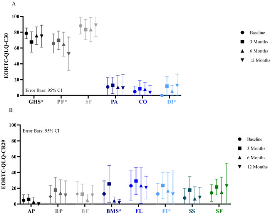Quality of life according to the EORTC-QLQ-C30 (A) and EORTC-QLQ-CR29 (B). Functional scales, higher scores mean better results; GHS = Global health status; PF = Physical functioning; SF = Social functioning. Symptom scales, lower scores mean better results; PA = Pain; CO = Constipation; DI = Diarrhea; AP = Abdominal pain; BP = Buttock pain; BF = Bloating; BMS = Blood and mucus in stool; FL = Flatulence; FI = Fecal incontinence; SS = Sore skin; SF = Stool frequency. * Difference of 10 points is considered clinically relevant.