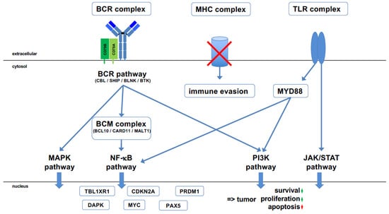 Major pathways involved in PCNSL pathogenesis. Various molecular alterations converge on the B cell receptor (BCR) pathway, which is tonically activated. This is complemented by the Toll-like receptor (TLR) pathway, which is activated by mutated MYD88, a master signaling instance of the TLR pathway. CD79B, encoding part of the BCR complex, is the second most frequently mutated gene in PCNSL. Several other genes that regulate the BCR pathway are mutated in a characteristic manner; genes with an inhibitory effect are rendered non-functional and genes activating the BCR pathway are constitutively activated. The BCM complex, consisting of BCL10, CARD11, and MALT1, functions as a gatekeeper of the NF-kB pathway. CARD11 is recurrently mutated; MALT1 is part of the recurrent 18q21 amplification, often together with the anti-apoptotic BCL2 gene. A hallmark of PCNSL is an activated NF-κB pathway, although the genes of the NF-κB pathway are not recurrently mutated. Tonic BCR signaling activates at least three different pathways, including the NF-κB pathway, the PI3 kinase (PI3K) pathway, and the MAP kinase (MAPK) pathway. TLR signaling also activates the NF-κB pathway, the PI3K pathway, and the JAK/STAT pathway. The tumor suppressor gene CDKN2A, which encodes p14ARF and p16INK4a, is rendered non-functional in PCNSL through either mutation or methylation. TBL1XR1 and PRDM1 mutations are responsible for a shift in B cell differentiation to an IgM memory B cell-like phenotype. The synergistic effect of the various activated pathways, together with mutations in distinct genes and the constitutive expression of important transcription factors for B cell differentiation, including MYC and PAX5, results in tumor cell survival with increased proliferation and blocked apoptosis. In addition, a loss of MHC class I facilitates immune evasion in an immunoprivileged organ.
