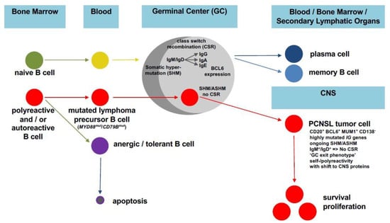 The key to PCNSL lymphomagenesis is the GC reaction [49]. Physiologically, B cell development corresponds to precisely defined molecular modifications of the IG genes in defined organs of the immune system, yielding mature B cells that characteristically recognize a specific, unique antigen with a high affinity via their BCR [50]. Briefly, the bone marrow progenitors of B cells first rearrange the V, D, and J segments of the IG heavy (IgH, 14q32.33) chain loci and then the V and J genes of their light chain loci (Igλ, 22q11.2, Igκ 2p11.2) are rearranged as pre B cells. After light chain rearrangement and the first expression of a BCR as an IgM molecule at the immature B cell stage, counterselection takes place, leading to strong self-reactivity. B cells with autoreactivity are either edited (new light chain rearrangements) or eliminated by apoptosis. After successfully expressing a BCR without (strong) self-/polyreactivity, the respective B cells leave the bone marrow to circulate through the peripheral blood and secondary lymphatic organs as naïve, mature B cells. Antigen encounter together with T cells help initiate the GC reaction, which aims at increasing the affinity of the BCR for its specific antigen. The molecular process that builds the basis for affinity maturation is the process of SHM, through which point mutations and some indels are introduced into rearranged IG heavy- and light-chain V genes, starting downstream of the promoter of rearranged IGV genes. In addition to this process of SHM, many cells also undergo IG CSR in the GC. CSR corresponds to the replacement of the µ and δ IG heavy-chain constant region genes of the BCR with one of the constant-region genes located downstream to generate IgG, IgA, or IgE antibodies with distinct effector functions. As the complex processes of SHM and CSR require the introduction of DNA strand breaks at the respective loci combined with error-prone repair mechanisms, GC B cells are highly vulnerable to oncogenic events [51]. Only B cells that have successfully passed these complex processes, usually after multiple rounds of proliferation, mutation, and selection are allowed to terminally differentiate into memory B cells or plasma cells; if not, they undergo apoptosis (Figure 3). Thus, there are several major checkpoints of B cell differentiation before the entrance, inside and at the exit of the GC.