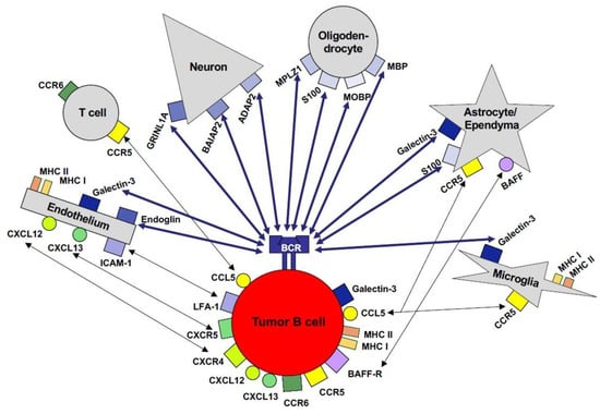 Regarding potential BCR-mediated interactions in the CNS, tumor and/or precursor cells may interact with CNS proteins in a cell-type-specific manner with various resident CNS cell populations (Figure 4) [53,54,55,56]. Physiologically, neurons express GRINL1A, BAIAP2, ADAP2 (centaurin-α) [53], and SAMD14 [55]; MPLZ1, MBP, and MOBP are constituents of myelin/oligodendrocytes [53], and S100 protein family members are expressed by astrocytes and oligodendrocytes [53]. Under pathological conditions, including tumor infiltration and inflammation, CNS cells upregulate further proteins recognized by the BCR of the tumor cells. For example, cerebral endothelial cells express endoglin and galectin-3; galectin is also induced in activated astrocytes and microglia/macrophages (Figure 4) [53]. The expression pattern of proteins that may serve as antigens for the binding of tumor cells via their BCR may also contribute to the preferential growth of PCNSL in the deep grey and white matter of the cerebral hemispheres.