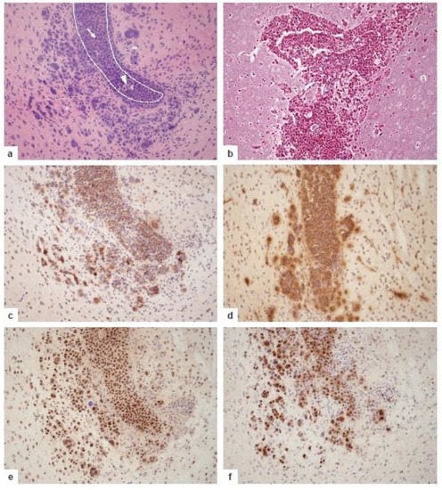 - Bruck, W.; Nervensystems, N.L.U.L.L.D.; Brunn, A.; Klapper, W.; Kuhlmann, T.; Metz, I.; Paulus, W.; Deckert, M. Differenzialdiagnose lymphoider Infiltrate im Zentralnervensystem. Der Pathol. 2013, 34, 186–197. [Google Scholar] [CrossRef]
