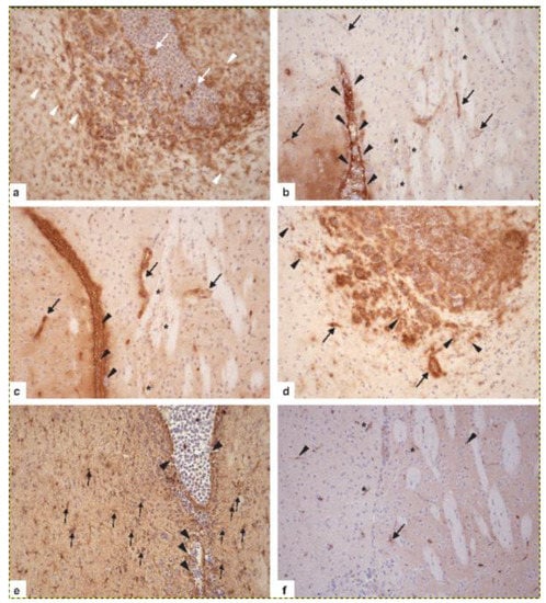 Activation of resident CNS cell populations in murine PCNSL at day 16 after the transplantation of 5 × 105 BAL17CNS cells into the right frontal lobe of BALB/C mice. (a) In the vicinity of BAL17CNS lymphoma, CD11b/c+ microglial cells in the cingulate cortex, the corpus callosum, and the striatum are prominently activated as evidenced by long, elongated, ramified processes (arrowheads). Note that activation as indicated by morphology, i.e., staining intensity with the anti-CD11b/c antibody and ramification of processes, increases with the proximity to the lymphoma. Some CD11b/c+ macrophages are present within bulk lymphoma (arrows). Immunohistochemistry with anti-Mac-1α (C3bi receptor) antibody (ATCC, clone M1/70.15). (b) ICAM-1 is expressed on ependymal cells of the lateral ventricle (arrowheads) and on BAL17CNS lymphoma cells in the lumen of the lateral ventricle (white *). Cerebral endothelial cells of small capillaries in the cingulate cortex and the caudate putamen have upregulated ICAM-1 (arrows). Here, some microglial cells also have induced ICAM-1 (black *). Immunohistochemistry with hamster anti-CD54 (ICAM-1) antibody (clone 3E2, BD Biosciences, Heidelberg, Germany). (c) MHC class I antigen is upregulated on cerebral endothelial cells (arrows) and microglia (*) close to the lateral ventricle, which harbors BAL17CNS lymphoma cells (arrowheads). Immunohistochemistry with anti-H-2 antibody (all haplotypes, ATCC, clone M1/42.3.9.8 HLK). (d) MHC class II antigen is expressed on a fraction of BAL17CNS lymphoma cells in the lumen of the lateral ventricle and the adjacent cingulate cortex and corpus callosum, on cerebral endothelial cells (arrows), and on strongly activated microglia (arrowheads). Immunohistochemistry with anti-I-A antibody (b,d,q haplo-types, ATCC clone M5/114.15.2). (e) Lymphoma cells have focally destroyed the ependymal wall of the lateral ventricle (arrowheads) and have invaded the adjacent periventricular tissue. The prominent activation of GFAP+ astrocytes (arrows) intermingled with tumor cells. Immunohistochemistry with polyclonal rabbit anti-GFAP (Agilent, Santa Clara, CA, USA). (f): In the vicinity of lymphoma cells, cerebral endothelial cells (*), an astrocyte (arrow), and microglial cells (arrowheads) have upregulated galectin-3. Immuno-histochemistry with rabbit-anti-galectin-3 (clone EP27754, Abcam). (a–f) Original magnification, ×200.