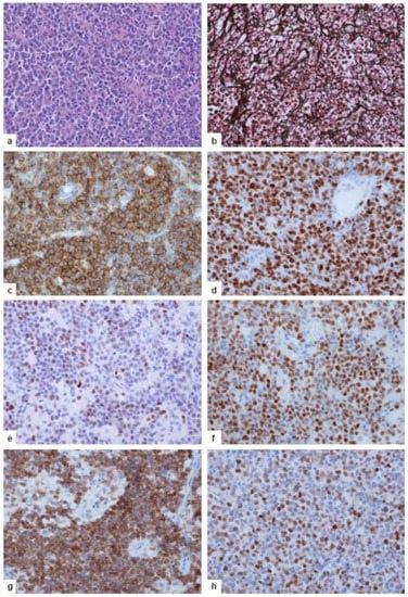 - Riemersma, S.A.; Oudejans, J.J.; Vonk, M.J.; Dreef, E.J.; Prins, F.A.; Jansen, P.M.; Vermeer, M.H.; Blok, P.; Kibbelaar, R.E.; Muris, J.J.; et al. High numbers of tumour-infiltrating activated cytotoxic T lymphocytes, and frequent loss of HLA class I and II expression, are features of aggressive B cell lymphomas of the brain and testis. J. Pathol. 2005, 206, 328–336. [Google Scholar] [CrossRef]