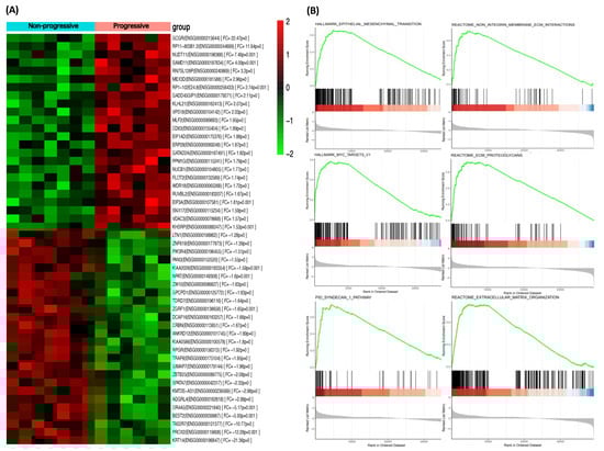 Differentially expressed genes in the discovery phase. (A) Heat map displaying the 50 most DEGs between progressive and non-progressive intermediate/high-risk ccRCC patients. Red pixels correspond to up-regulated genes, whereas green pixels indicate down-regulated genes. (B) GSEA shows positive correlation of DEGs in pathways involved in tumor progression. Abbreviations: DEGs, Differentially expressed genes. GSEA, Gene set enrichment analysis.