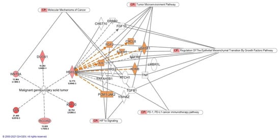 Using IPA we found that HS6ST2 interacts with several molecules involved in different cancer pathways, as illustrated in Figure 2. Moreover, HS6ST2 was found to be associated with formation, activation, sprouting, and tubulation of vascular endothelial cells. Tumor development and angiogenesis are part of the five top organismal processes related to HS6ST2.