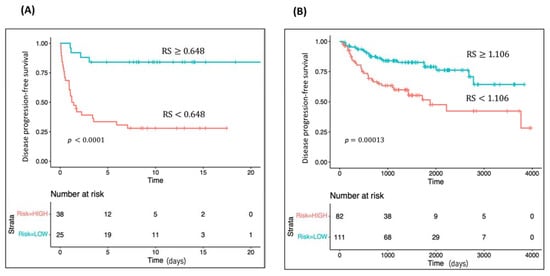 We evaluated the predictive capability for disease progression of our combined model in 202 intermediate/high-risk ccRCC samples obtained from the TCGA cohort. A RS for disease progression was computed for each patient. A ROC analysis was performed, and the Youden’s index value (1.106) was used as a cut-off. The AUC value of the model was 0.678, showing greater discriminatory ability than clinicopathological variables and gene expression alone (AUC pT = 0.620; AUC tumor size = 0.669; AUC ISUP grade = 0.556; AUC HS6ST2 = 0.642). The Kaplan Meier curve revealed that patients with a high-risk score have shorter disease-free survival (HR 2.74; p < 0.0002) (Figure 3B). Moreover, we carried out a Kaplan Meier sub-analysis using the RS of our combined model to evaluate its performance in the intermediate and high-risk ccRCC samples separately. The combined classifier was found to be statistically significant in the subset of high-risk ccRCC TCGA cohort (HR 2.40; p = 0.015). (Figure S4).