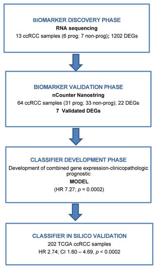 This study was split into four-stage approach with an initial biomarker discovery phase, a biomarker validation phase, a classifier development phase, and, lastly, the in silico external validation using the TCGA cohort [36,37] (Figure 4). Initial discovery phase included 13 ccRCC patients from Hospital Clinic of Barcelona, six progressive and seven non-progressive. Biomarker validation phase comprises 71 ccRCC patients from the Oncologic Institute of Valencia (IVO). From this, 64 ccRCC patients were eventually included in the study, 31 progressive and 33 non-progressive (Table 1). The remaining seven patients were discarded because of low count values in Nanostring analysis. Tissue samples were obtained under institutional review board-approved protocols (HBC/2016/0333 and 2017-59-BIOBANCOFIVO-15-2017).