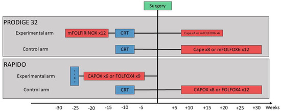 Stage II-III rectal cancers are generally treated with neoadjuvant long-course chemoradiotherapy (CRT) or short-course radiotherapy (SCRT) before surgery, which were shown to improve local control. Two trials compared these two treatment strategies, and they are considered to be equivalent [1,2]. European and American guidelines consider CRT and SCRT interchangeable, leaning towards CRT when tumour downsizing is needed to achieve clear resection margins [3,4]. Despite these treatments, 25–30% of patients will develop distant metastases, with a high risk of ultimately dying of their recurrent disease. Indeed, the impact of adjuvant chemotherapy in this setting is strongly limited by the reduced compliance and limited, if any, effectiveness [5]. These considerations fuelled the idea to intensify the neoadjuvant treatment with systemic chemotherapy, ultimately leading to a novel approach called Total Neoadjuvant Treatment (TNT). Up until now, the literature about TNT was crowed of retrospective series and small randomised trials [6]. These early reports showed important proportions (up to 28%) of patients achieving pathological complete response (pCR), opening a window of opportunity for a watch and wait strategy for those achieving clinical complete response (cCR) [5,7]. A few months ago, the first two large, randomised phase III trials comparing TNT with the standard approach, in both cases CRT, released their preliminary results [8,9]. RAPIDO compared SCRT followed by 6 cycles of CAPOX or 9 cycles of FOLFOX4 consolidation chemotherapy and surgery (without adjuvant treatment) with CRT followed surgery and 8 cycles of CAPOX or 12 cycles of FOLFOX4 adjuvant chemotherapy, Figure 1 [8]. PRODIGE-23 compared 12 cycles of modified FOLFIRINOX followed by CRT, surgery and 4 cycles of capecitabine or 6 cycles of modified FOLFOX6 adjuvant chemotherapy with CRT, followed by surgery and 8 cycles of capecitabine or 12 cycles of modified FOLFOX6 adjuvant chemotherapy [9]. Both studies met their respective primary endpoints with statistically significant hazard ratios. Undoubtedly, they will change the practice and quickly make their way into international guidelines.