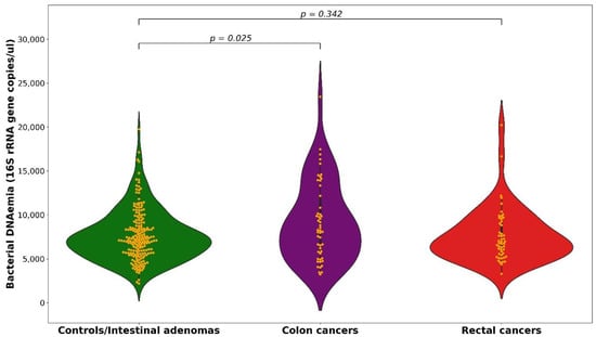 We found an overall mean of 7687 16S rRNA gene copies per µL of blood, with a mean of 7628 among controls, 7586 among IA and 8387 among CRC subjects (9145 in colon and 7629 in rectal cancers), with no significant differences between the three groups (p for heterogeneity = 0.482) (Supplementary Figure S1). Since 16S rRNA gene copy distribution was very similar in control and IA subjects (p for heterogeneity = 0.95), we grouped them as reference group and compared their 16S rRNA gene copy distribution with that of CRC, colon and rectal cancer cases. We found significant differences between colon cancer and control/IA (p = 0.025; Figure 1).
