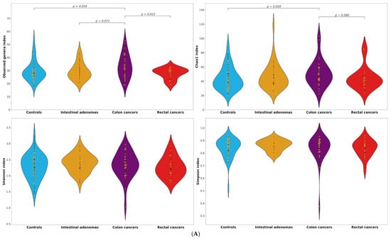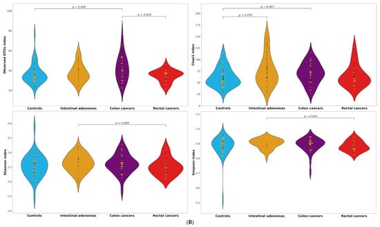 (A) Distributions of observed, Chao1, Shannon and Simpson alpha-diversity indices among controls, intestinal adenomas, colon and rectal cancers for genera among the highest two quintiles of 16S rRNA gene copies. (B) Distributions of observed, Chao1, Shannon and Simpson alpha-diversity indices among controls, intestinal adenomas, colon and rectal cancers for the operational taxonomic units (OTUs) among the highest two quintiles of 16S rRNA gene copies.